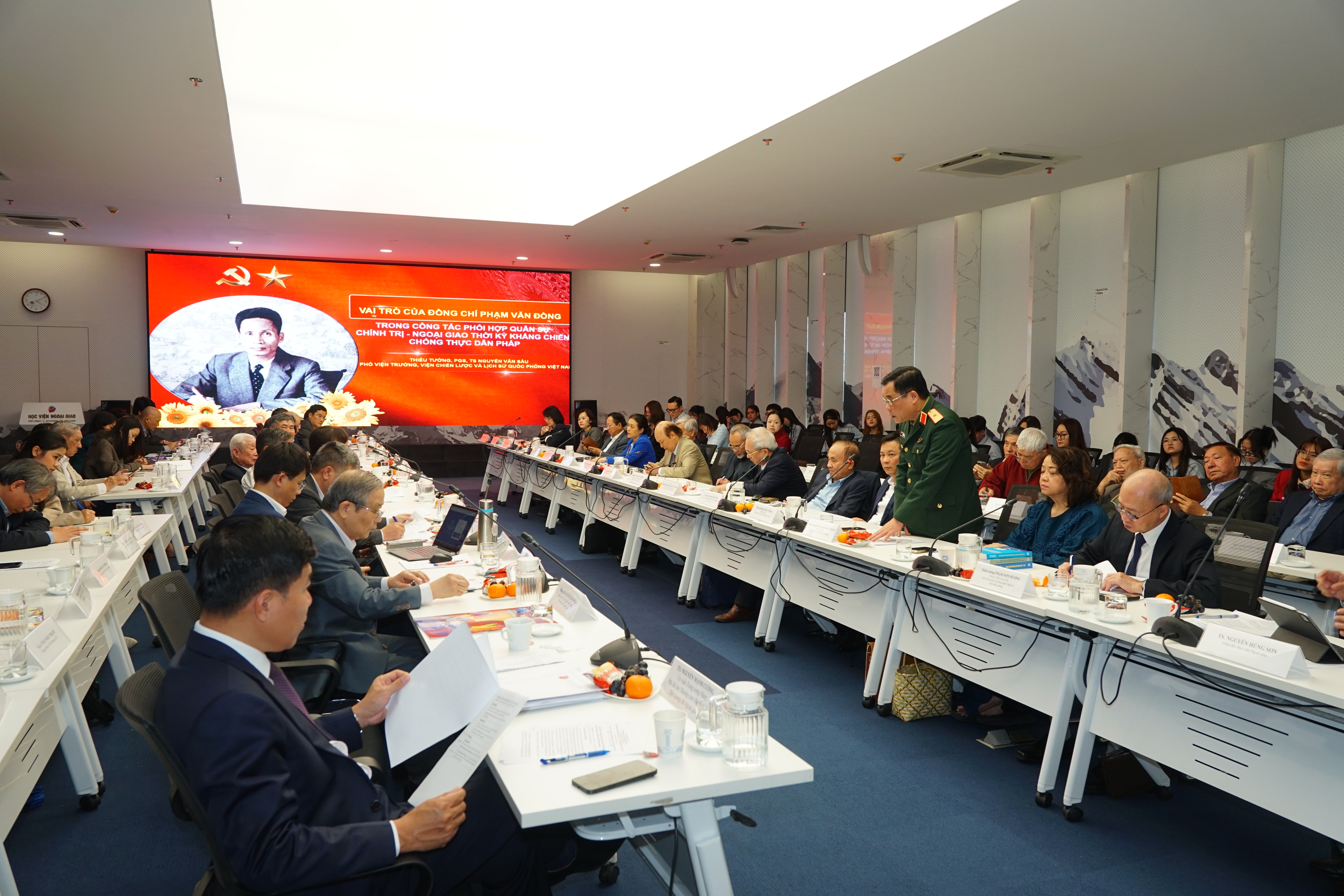 Tham dự Hội thảo có hơn 100 đại biểu, gồm các đồng chí nguyên lãnh đạo Bộ Ngoại giao, lãnh đạo Ban Đối ngoại Trung ương, đại diện một số ban, bộ, ngành Trung ương, cơ quan nghiên cứu, các Đại sứ, cán bộ lão thành, nhà khoa học, chuyên gia trong lĩnh vực đối ngoại, cùng đại diện các đơn vị thuộc Bộ Ngoại giao và giảng viên, sinh viên Học viện Ngoại giao. Đặc biệt, Hội thảo có sự tham dự của đồng chí Nguyễn Dy Niên, nguyên Ủy viên Trung ương Đảng, nguyên Bộ trưởng Bộ Ngoại giao, đồng chí Nguyễn Tiến Năng -nguyên Trợ lý cố Thủ tướng Phạm Văn Đồng, đồng chí Trần Tam Giáp -nguyên Thư ký cố Thủ tướng Phạm Văn Đồng và Thiếu tướng Phạm Sơn Dương, con trai cố Thủ tướng Phạm Văn Đồng cùng phu nhân.
